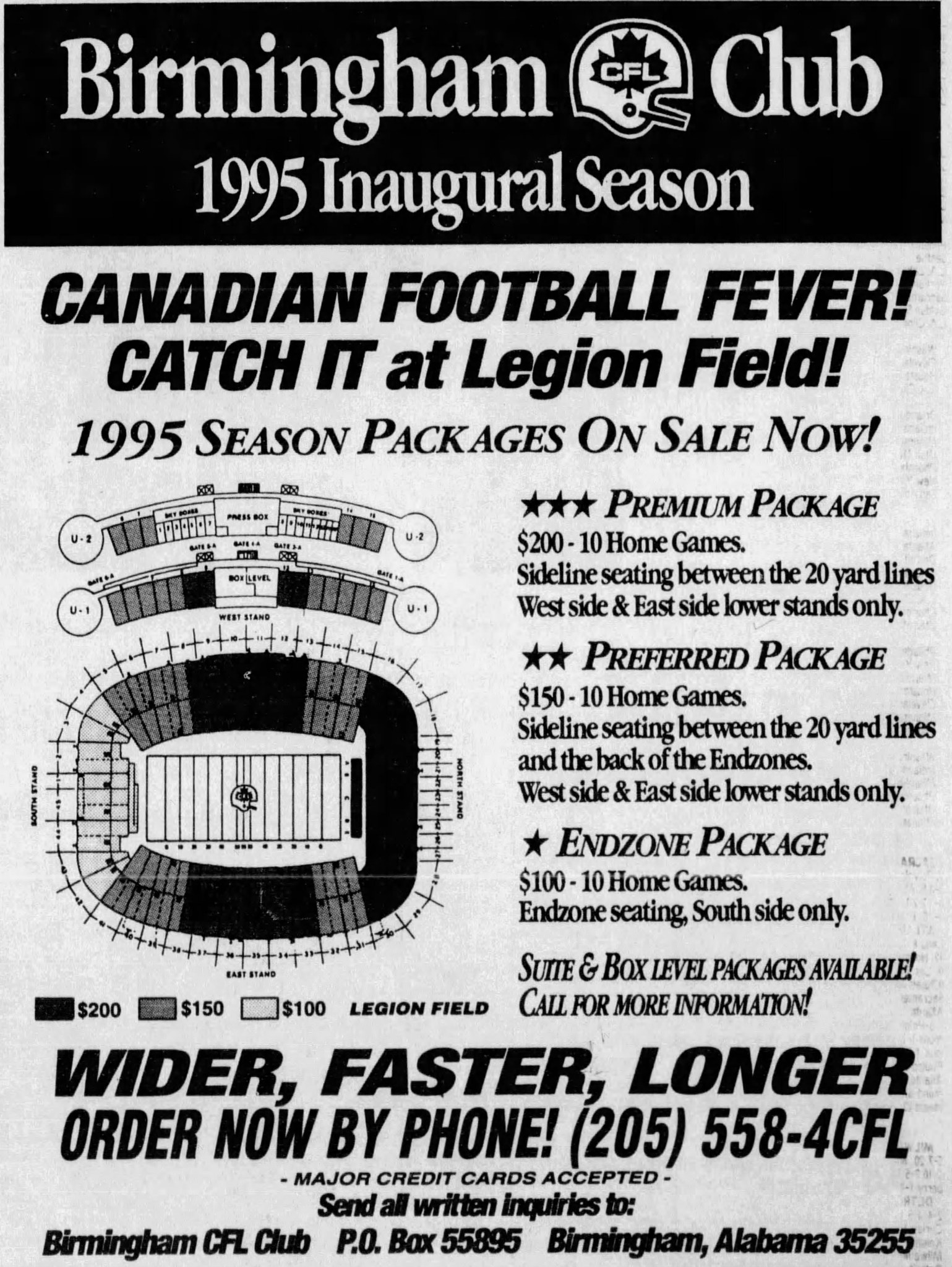 The Barracudas debuted at 75,000-seat Legion Field on July 15, 1995 with a 51-28 victory over the Hamilton Tiger-Cats. The opening day crowd of 31,185 marked a strong debut by CFL standards. Crowds stayed strong for the next two Saturday nights as well. 25,321 turned out for a 24-14 win over the Saskatchewan Roughriders on July 22nd and 30,729 for a 36-8 loss to the Baltimore Stallions on July 29th.
