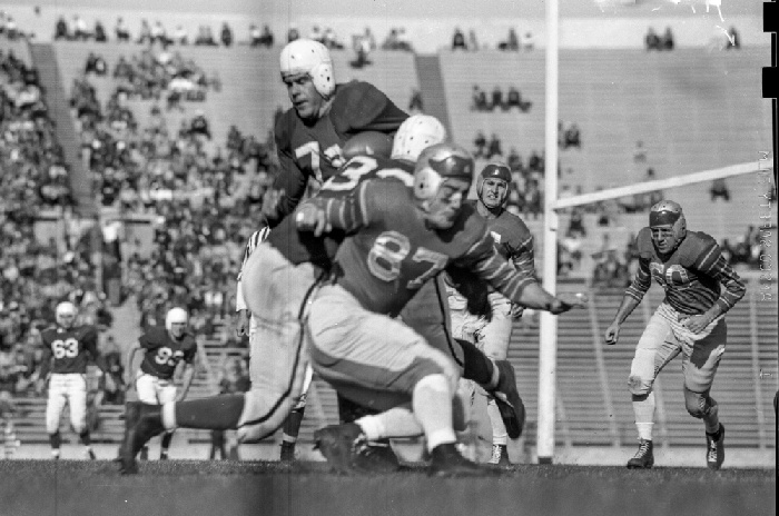 Initially, seven of the eventual eight AAFC cities were announced, including Buffalo. The plan was to start in 1945, but that was later pushed back to 1946. The Buffalo club, owned by local oil company magnate James Breuil, took the name Bisons, a moniker used by the city’s minor league baseball, minor league hockey, and pro basketball teams. On September 8, 1946, the Bisons debuted against the Brooklyn Dodgers at home in Buffalo’s Civic Stadium. The home team lost 27-14 before 25,489 fans. Things didn’t improve much, and the Bisons finished with a record of 3-10-1.