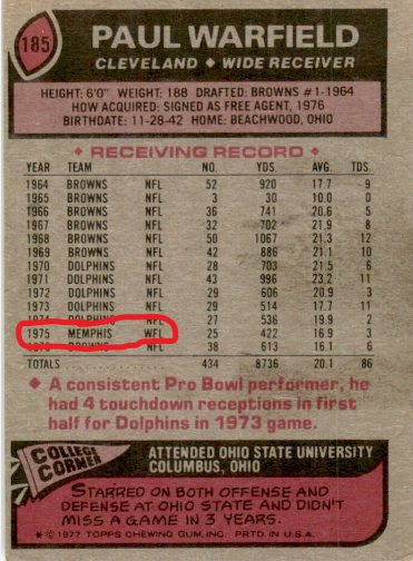 In 1977, while in the sixth grade, he was looking over his football cards and noticed something odd on the back of Paul Warfield’s. The then Browns wide receiver had played for one year (1975) with Memphis in something called the WFL. “What’s the WFL?” he asked his father.